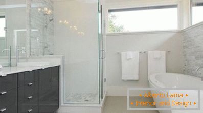 In solchen Räumen sind Acrylfonts mit kleinen Abmessungen oder kompakte Duschkabinen ideal geeignet. Um den Bereich visuell zu vergrößern, müssen Sie den entsprechenden Farbbereich und die Dekorationsmaterialien auswählen.